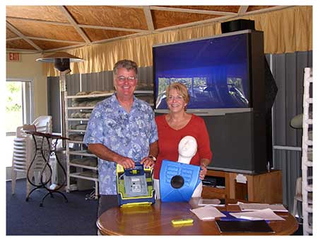 The Nevilles encouraged the Club Duck Key Board of Directors to purchase the Automatic External Defibrillator. AEDs are small, portable, and are used at Disney World, in malls, and by deputies in patrol cars. The device gives a ventricular shock to a person who is having a heart attack.